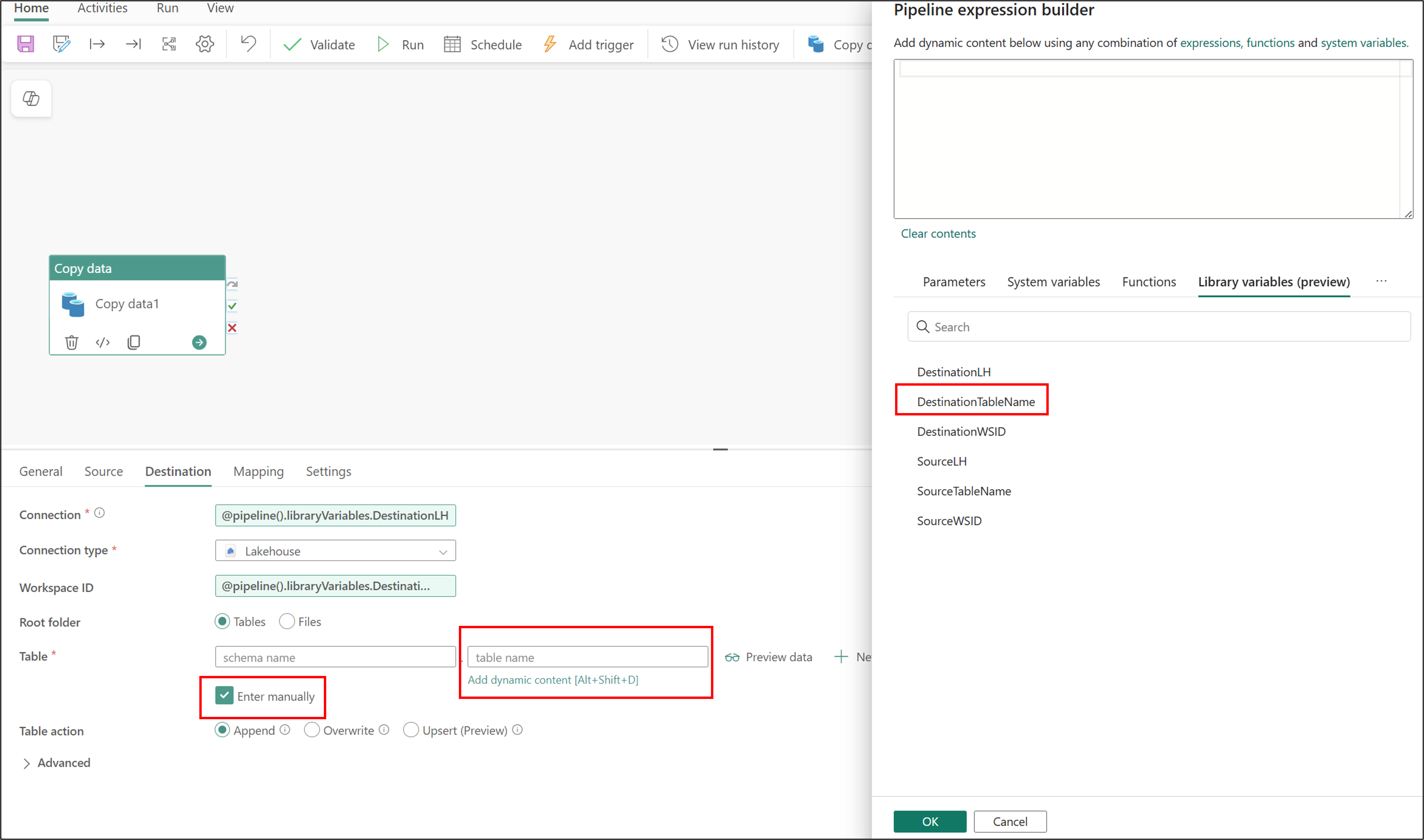 This tutorial shows you how to use dynamic content in Microsoft Fabric pipelines. When you create a variable library item and add variables to it, you can automate values for various stages of your deployment pipeline. In this tutorial, you copy data from one lakehouse to another. Then you use the variable library to set the source and destination values for the copy activity.