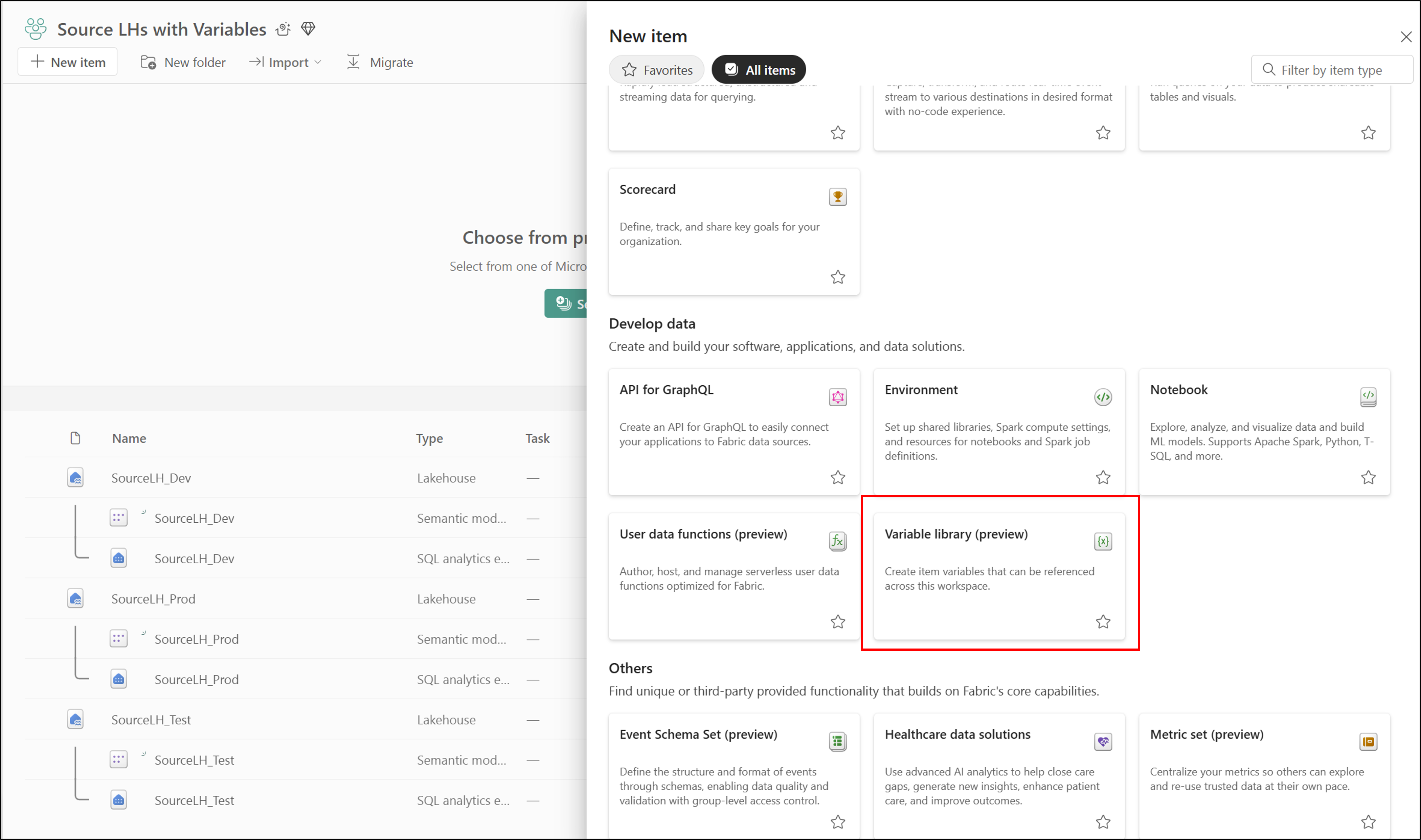 Repeat the preceding steps for the SourceLH_Dev and SourceLH_Test lakehouses in the Source LHs with Variables workspace.