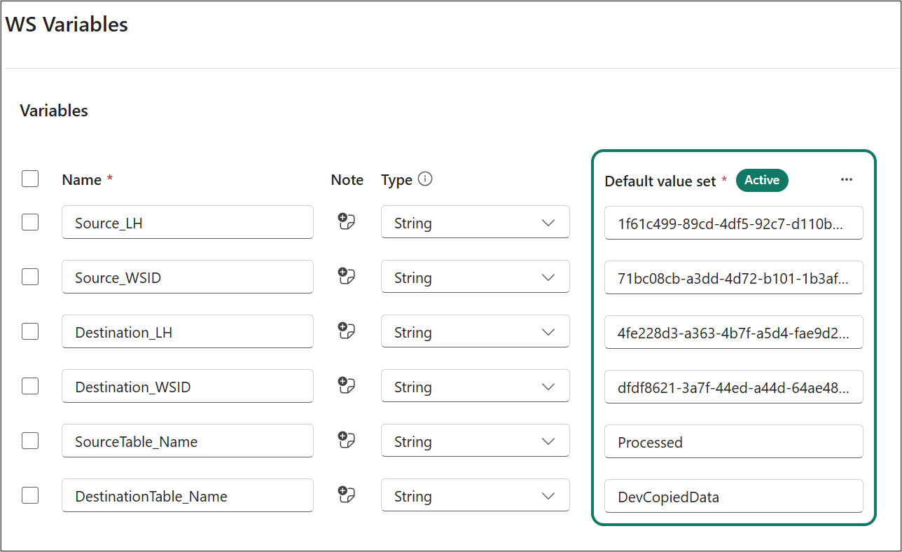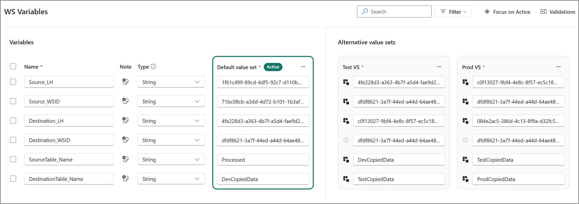 variable is set to the different values. You can edit these values directly in the UI or by editing this file in Git and updating it to the workspace.{ "$schema": "https://developer.microsoft.com/json-schemas/fabric/item/VariablesLibrary/definition/valueSets/1.0.0/schema.json", "valueSetName": "Test VS", "overrides": [ { "name": "Source_LH", "value": "4fe228d3-a363-4b7f-a5d4-fae9d2abca43" }, { "name": "DestinationTableName", "value": "TestCopiedData" } ] }