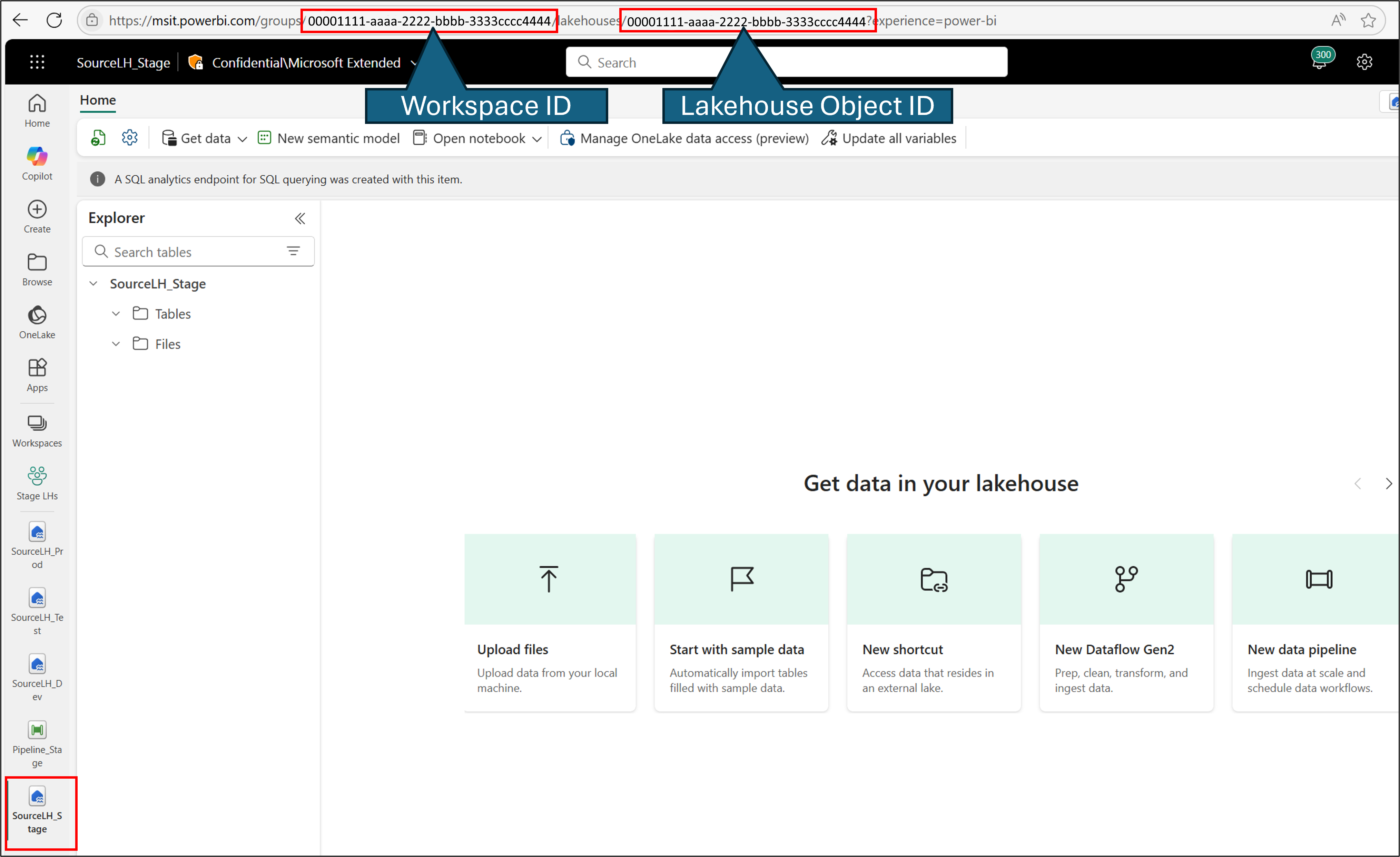 Copy the workspace ID and the lakehouse object ID in the URL.
