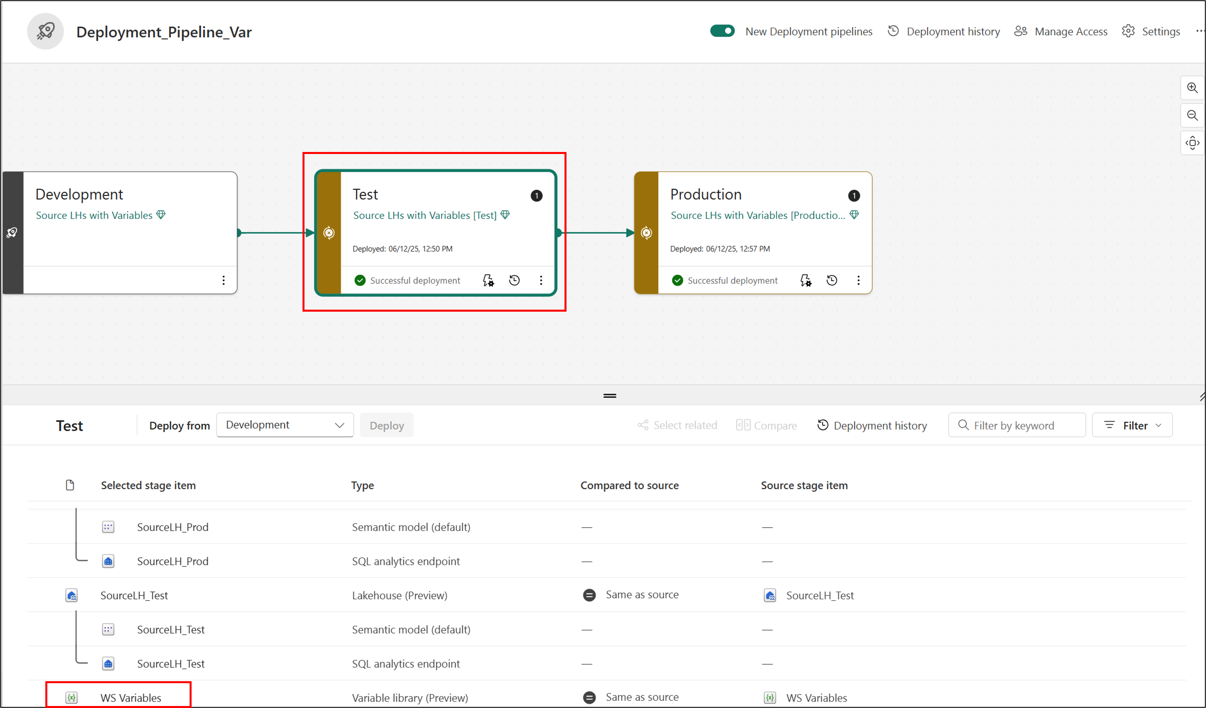 Now that you set up the variable library and configured all of the active sets for each stage of the deployment pipeline, you can verify them: