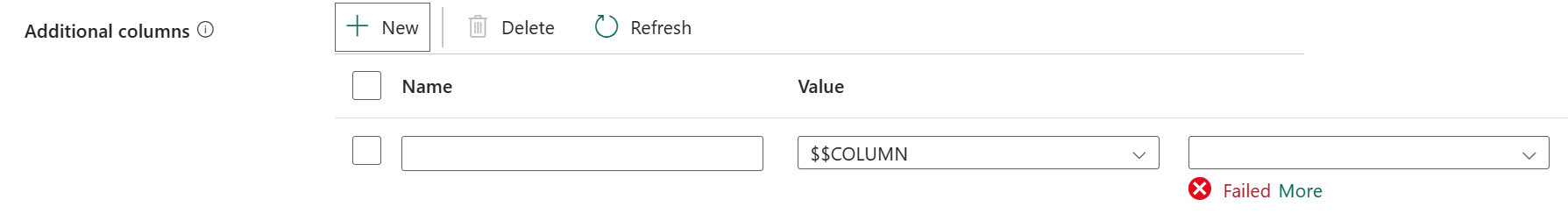 Additional columns: Add additional data columns to store source files' relative path or static value. Expression is supported for the latter. For more information, go to Add additional columns during copy.