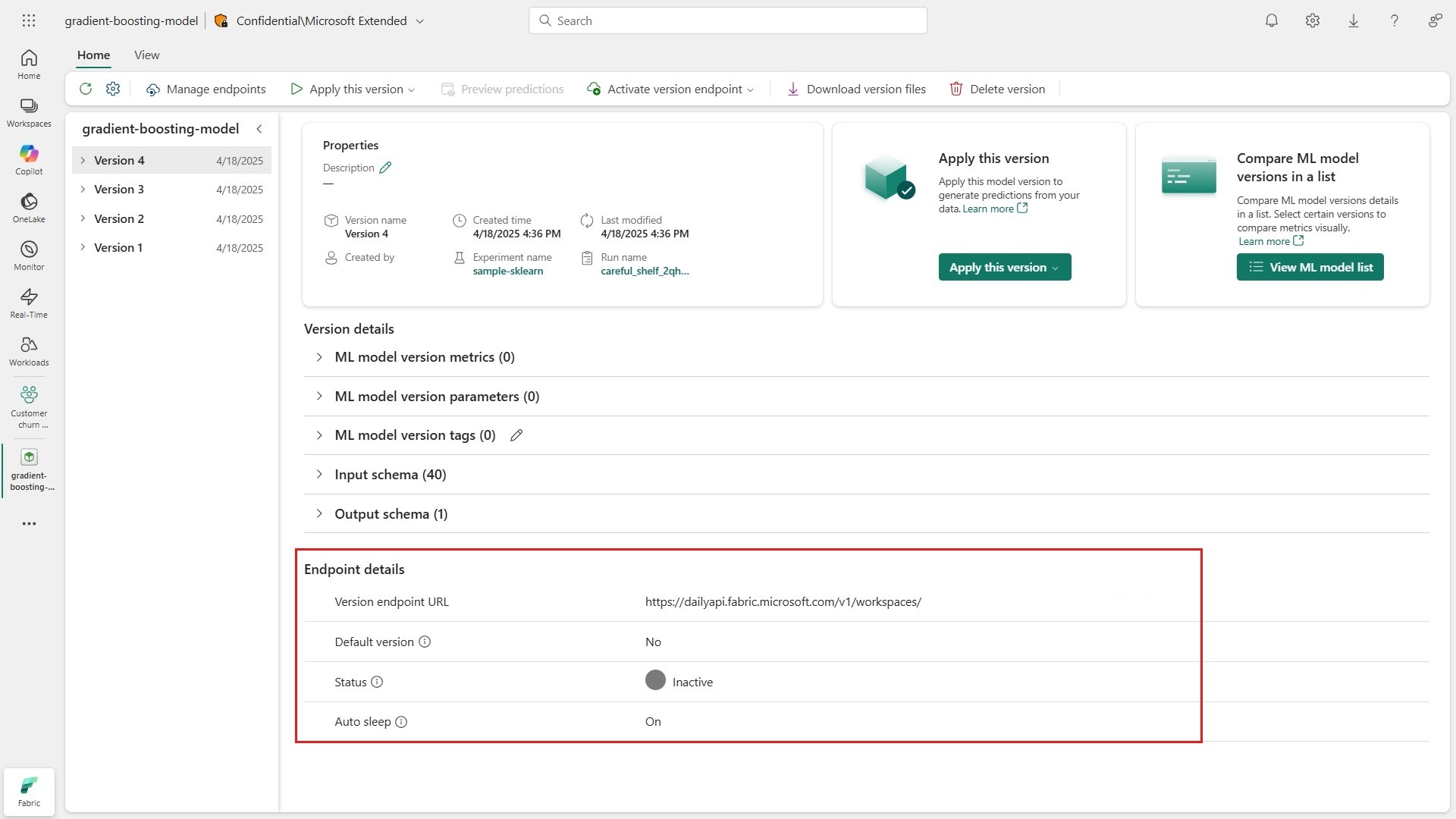 You can activate model endpoints directly from the Fabric interface. Navigate to the version that you’d like to serve real-time predictions and select "Activate version endpoint" from the ribbon.