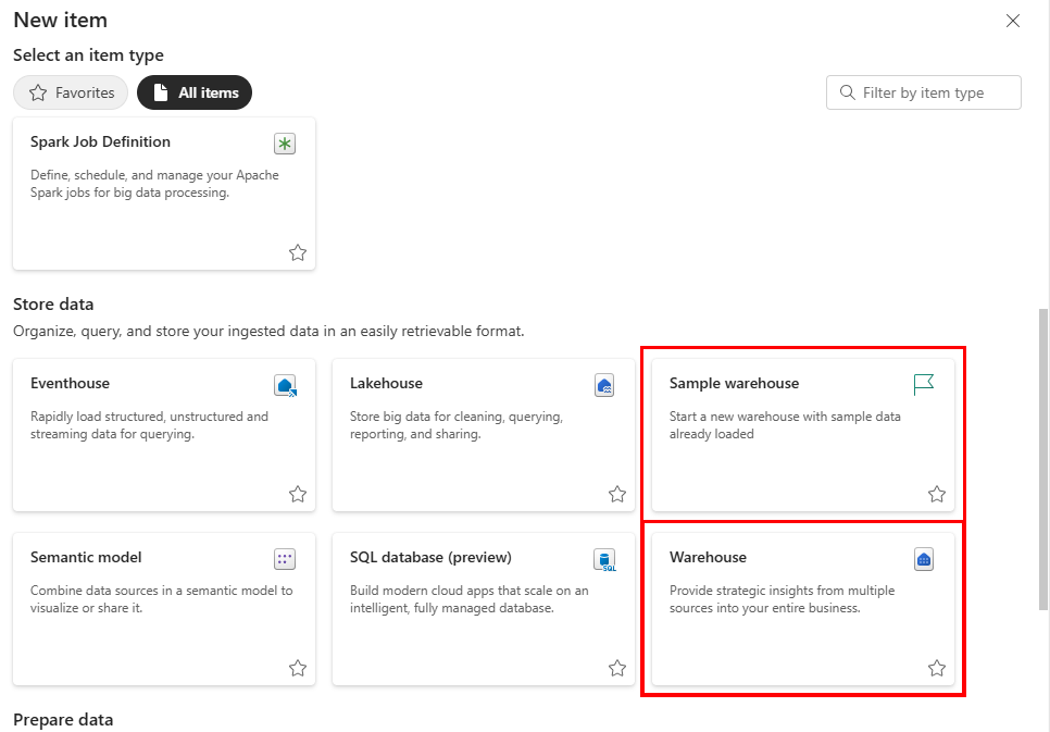 - In your workspace, select + New Item and look for the Warehouse or Sample warehouse card under the Store data section.