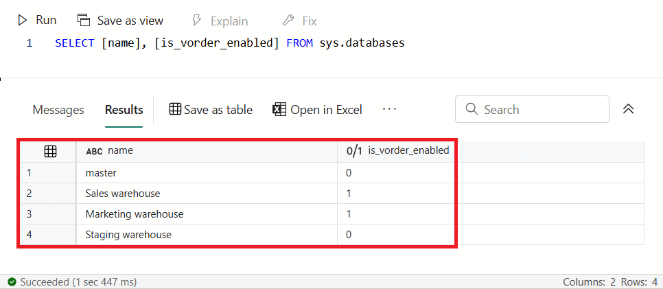 To check the current status of V-Order on all warehouses, of your workspace, use the following T-SQL code to query sys.databases in a new query window: