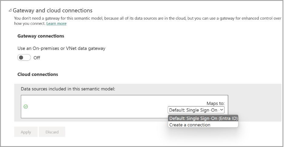 - Use a fixed identity to isolate users from a source Fabric artifact. Bind the Direct Lake model to a cloud connection. Keep SSO disabled on the cloud connection to use the fixed identity for refreshes and queries.