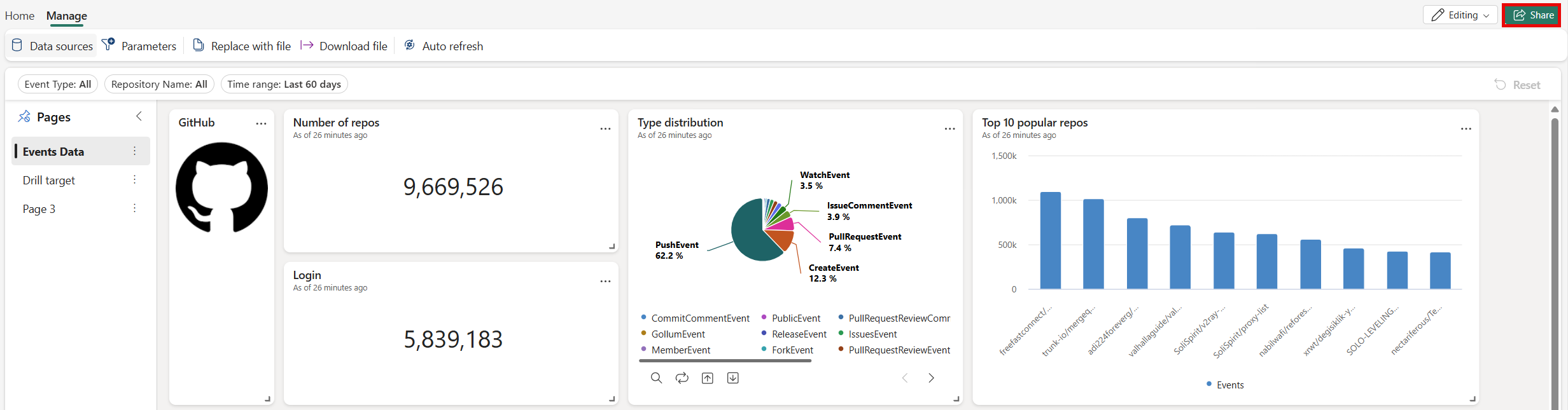 Under the Manage tab, you can manage data sources and parameters, as well as configure settings for Auto refresh.