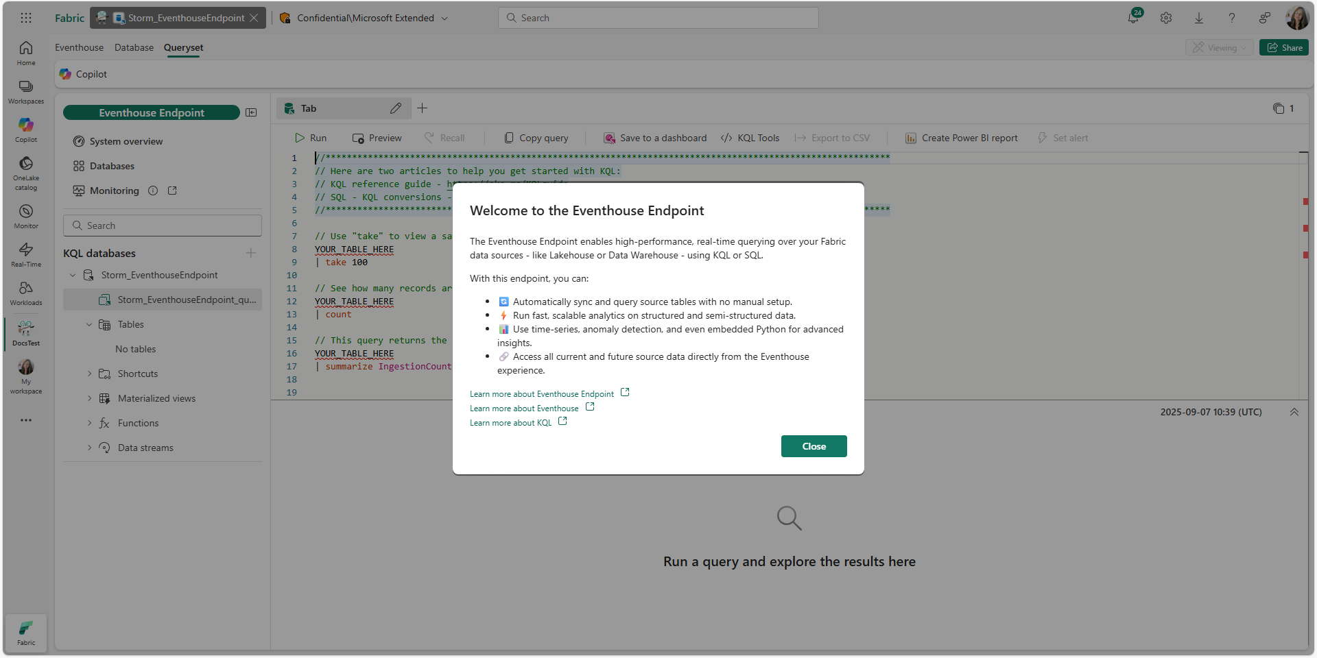 The Eventhouse Endpoint opens with a welcome message. Select Close to view and start querying the Eventhouse.