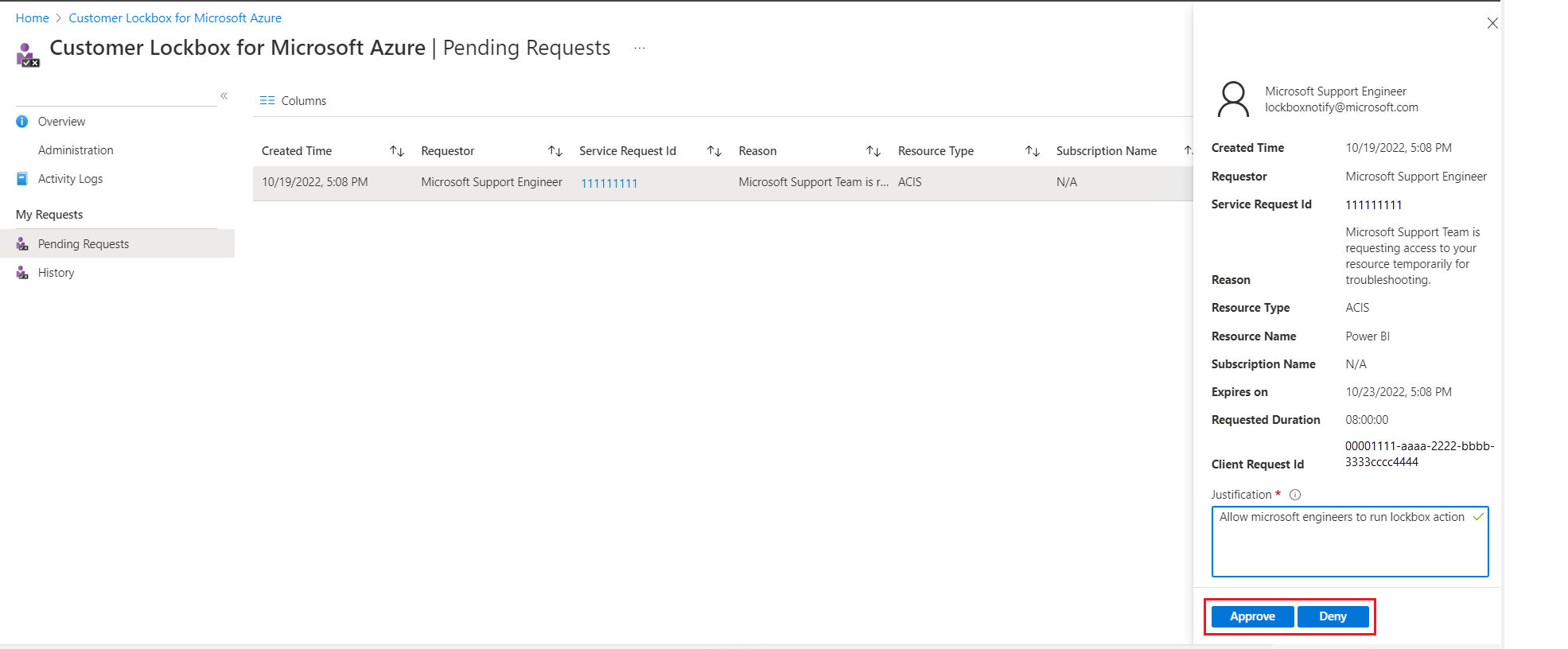 Approve - Access is granted to the Microsoft engineer for a default period of eight hours.