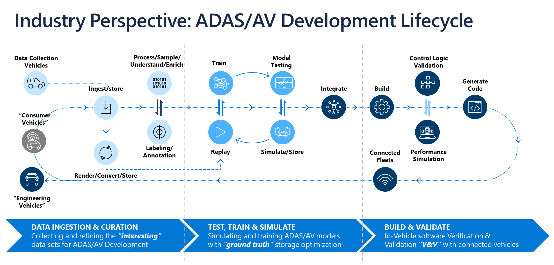 A typical industry flow for the autonomous vehicle development lifecycle highlighting three key stages is as follows: