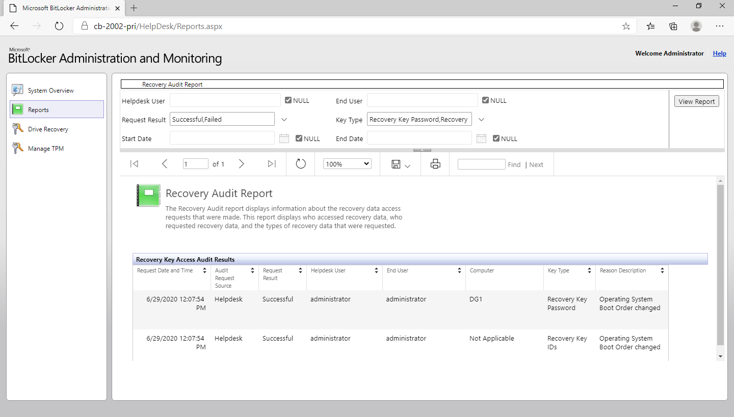Use this report to audit users who have requested access to BitLocker recovery keys. You can filter on the following criteria: