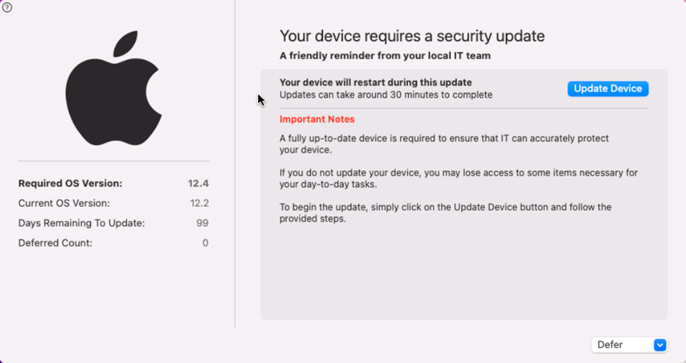 When Nudge is configured and deployed, end users see the following sample message when their device is ready to be updated. End users can also choose to update the device or defer the update: