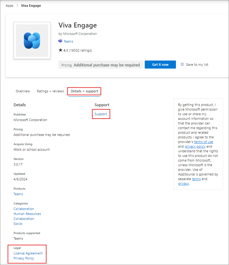 For publicly available store apps, links to Terms of Use, Privacy Policy, and Support are available on AppSource. Search for an application and navigate to its Details + Support tab for the links.