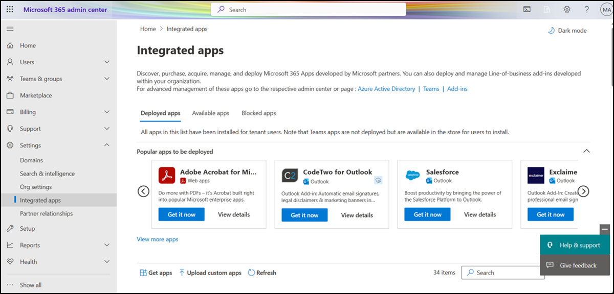 As an admin, the following app, agent, and add-in types can be managed from the integrated apps portal on the Microsoft 365 admin center.