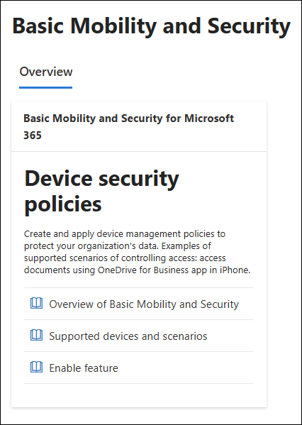 If Basic Mobility and Security is already enabled in your organization, Enable feature isn't available on the Overview tab of the Basic Mobility and Security page, so you can skip this step.