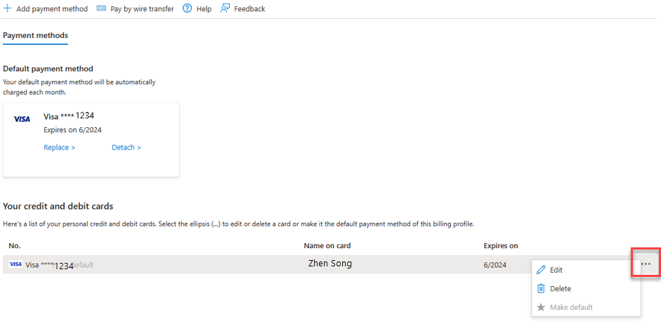 If you choose to edit the card, the Edit payment method flyout appears. Update the information in the page.