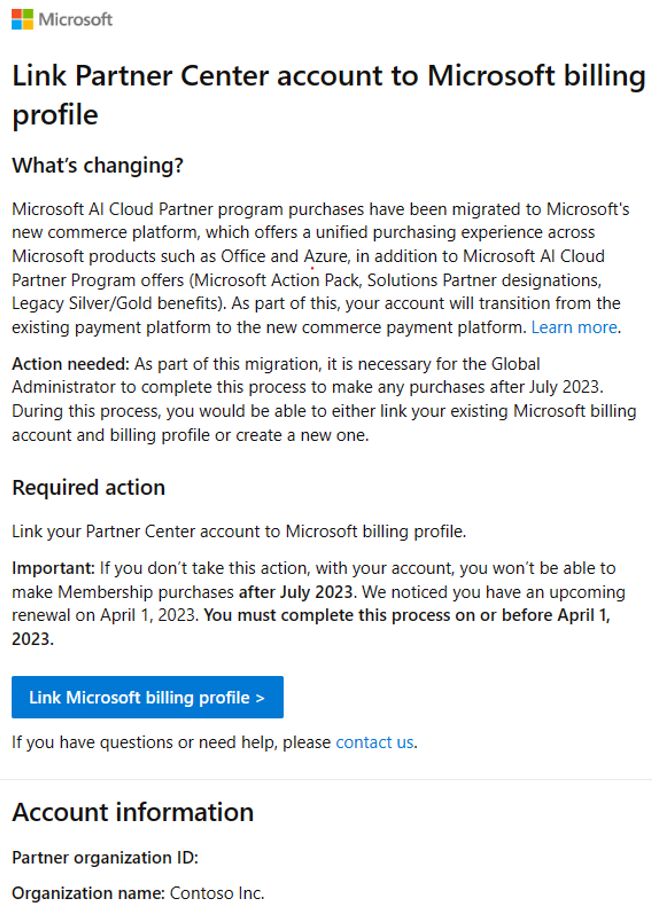 You receive an email from Microsoft and in-product notification that prompts you to link your Microsoft AI Cloud Partner Program Partner Center account to the Microsoft billing profile. Select Link Microsoft billing profile. Alternatively, you can start the process by selecting link Microsoft billing profile.