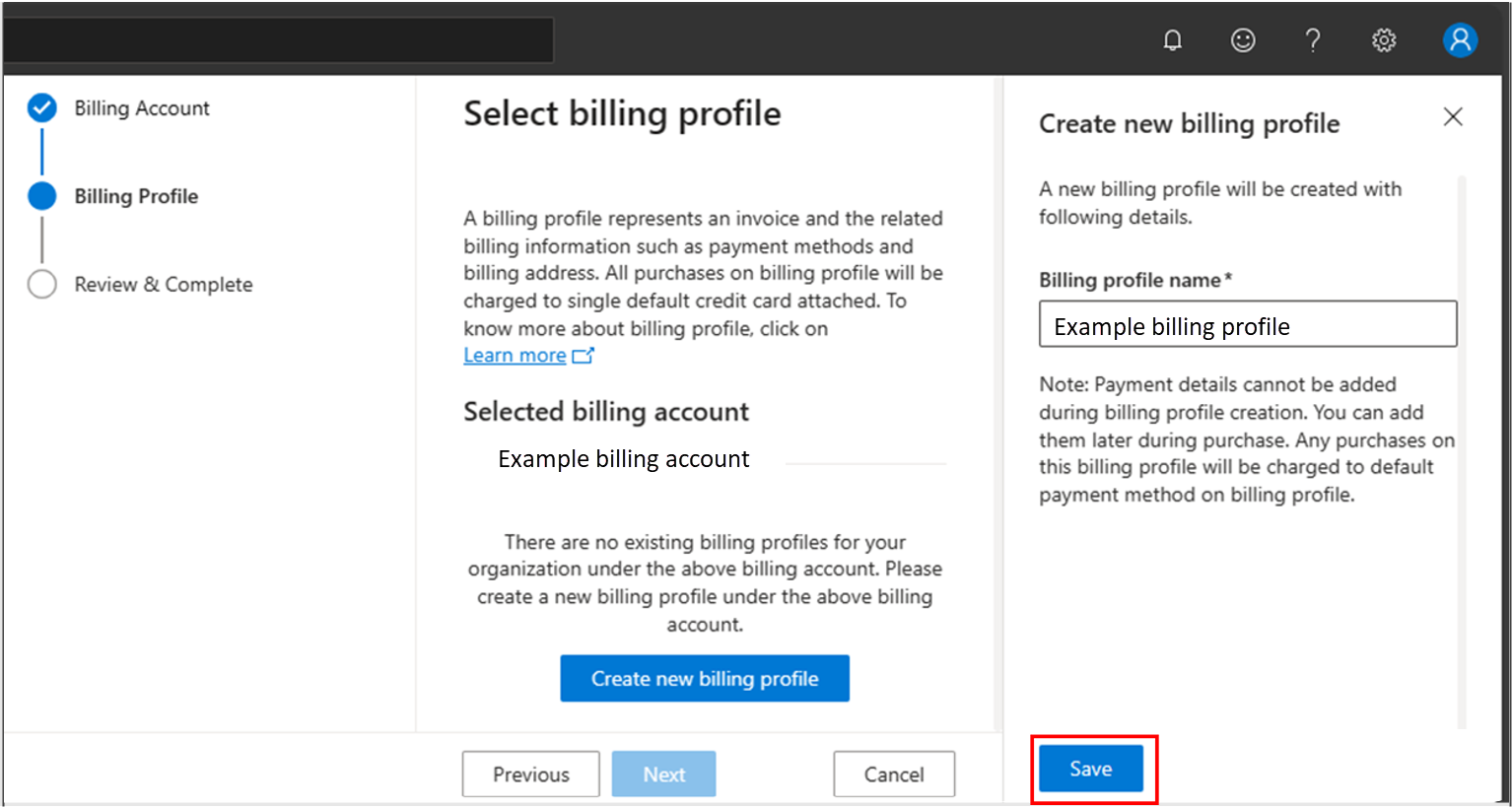 Enter a billing profile name, then select Save.
