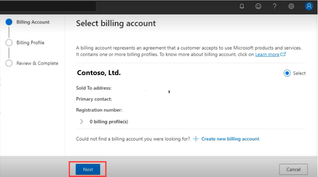 Select Next to enter the billing profile details. The billing profile is created under the previous billing account.