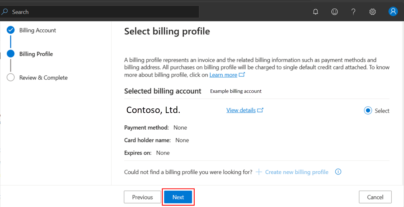 Select the billing profile under the selected billing account and choose Next.