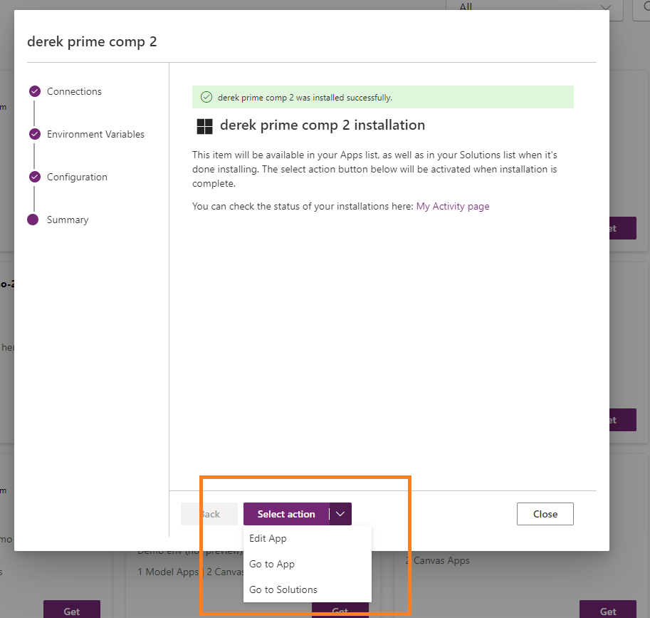 When you reach the final step, the summary screen, you're now waiting for the catalog item to install into your environment. Depending on the complexity, this might take from less than a minute to several minutes. When complete, you're given several options in the dropdown, depending on what's included in the catalog item, and if the author set a primary component. The following is an example where a canvas app is the primary component of the catalog item: