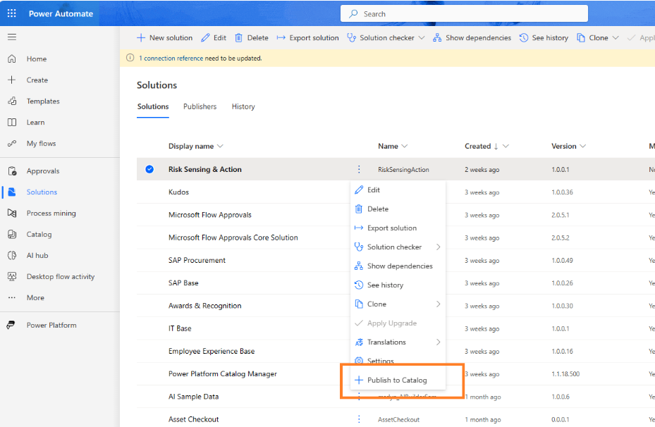 Navigate to your solutions page, and any unmanaged solution has a new option for Publish to Catalog in the three vertical dots next to the solution display name. This option is disabled for anyone without the Catalog Submitter role.