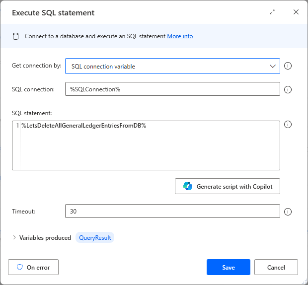 The query detects desktop flows that contain scripts potentially vulnerable to SQL injection by searching for the use of database.executesqlstatement.execute within the flow definitions. Consider a scenario where, instead of directly writing the SQL code in the Execute SQL statement action, the script uses a Power Automate desktop input variable (for example, %LetsDeleteAllGeneralLedgerEntriesFromDB%) provided to the script during runtime.