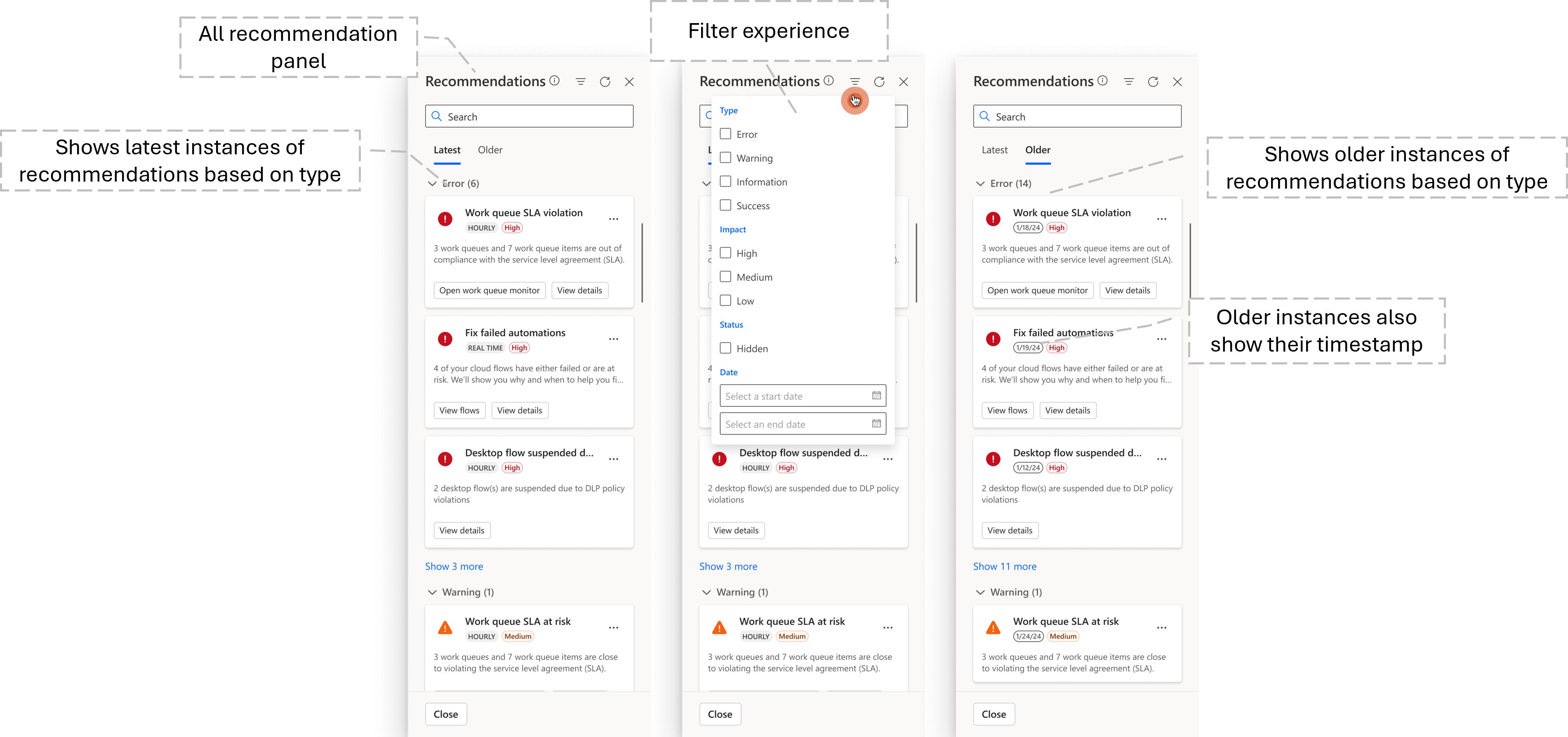 The all recommendations panel shown in the following image is used for viewing latest and older recommendation with filtering capabilities. The recommendations are categorized by type (Error, Warning, Information) and can be filtered by impact (High, Medium, Low), status (Hidden), and date range. This panel is divided into two main sections: one for displaying the most recent recommendations and another for showing older recommendations along with their timestamps. The most recent recommendations are initially displayed under 'Latest', but are replaced with refreshed content based on the recommendation interval.
