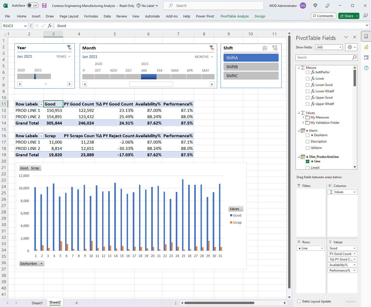 - If you connected using Analyze in Excel or the Power BI semantic model experience in Excel, your Excel workbook contains an empty PivotTable and Fields list from the Power BI semantic model.
