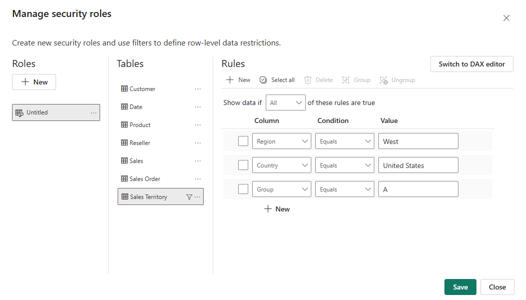 username()within this expression, but note thatusername()has the format ofDOMAIN\usernamewithin Power BI Desktop. Within the Power BI service and Power BI Report Server, it's in the format of the user's User Principal Name (UPN). Additionally, in this expression box, use commas to separate DAX function arguments even if you're using a locale that normally uses semicolon separators, such as French or German.You can switch back to the default editor by selecting Switch to default editor. When possible, all changes made in either editor interface persist when switching interfaces. You can define a role using the DAX editor that can't be defined in the default editor. However, if you do so, you're prompted with a warning if you attempt to switch to the default editor. The warning states that switching editors might result in some information being lost. To keep this information, select Cancel and continue only editing this role in the DAX editor.