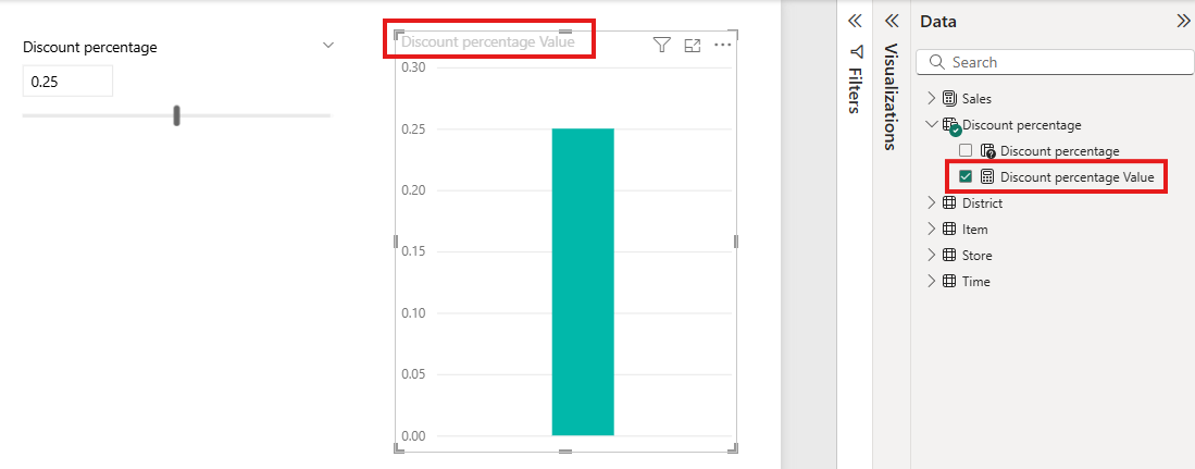 The new measure represents the total sales amount. Its value is calculated by applying the discount rate stored in your Discount percentage parameter.