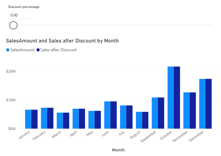 Move the slider for the Discount percentage parameter. The Sales after Discount column reflects the discounted sales amount.