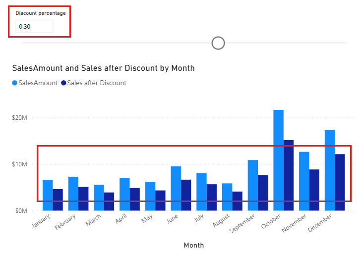 In Power BI, you can create complex and interesting measures that consumers of your reports can use to visualize the variable of your parameter. For example, you can create a report that sales people can use to observe the following data: