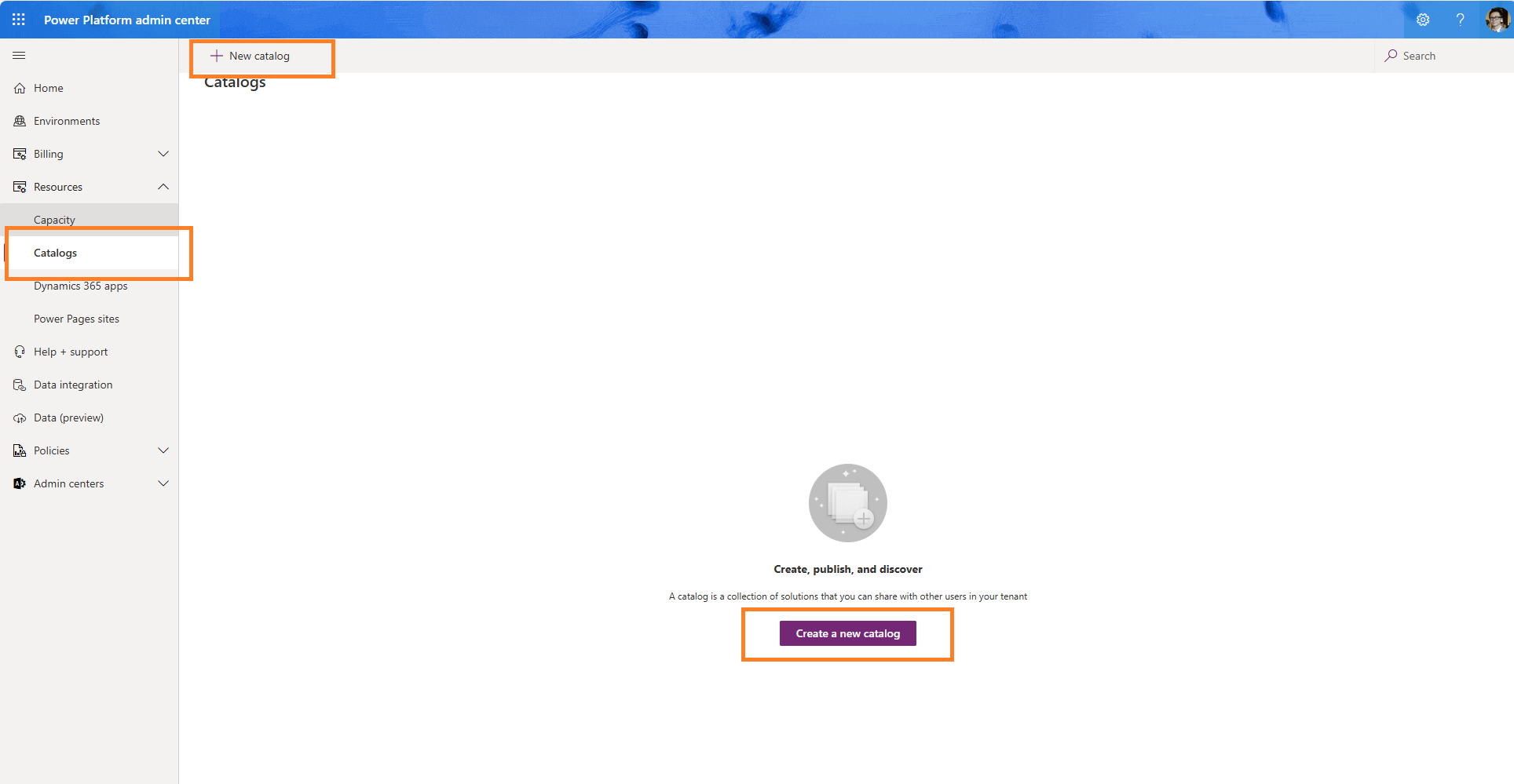 To set up a catalog, go to the Power Platform admin center for your tenant, and expand Resources and then select Catalogs.