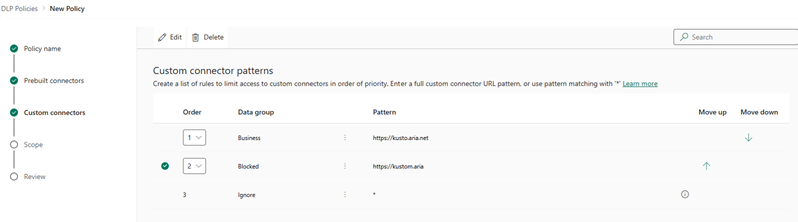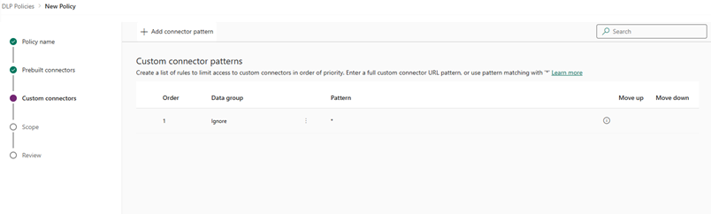 Ignore ignores data polciy classification for all connectors in this tenant-level policy, and defers evaluation of a pattern to other environments or tenant-level policies to attribute them into the Business, Non-Business, or Blocked grouping as appropriate. If no specific rule exists for the custom connectors, an Ignore * rule allows custom connectors to be used with both Business and Non-Business connector groupings. Except for the last entry in the list, Ignore as an action isn't supported for any other URL pattern added to the custom connector pattern rules.