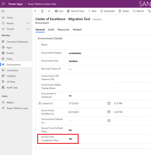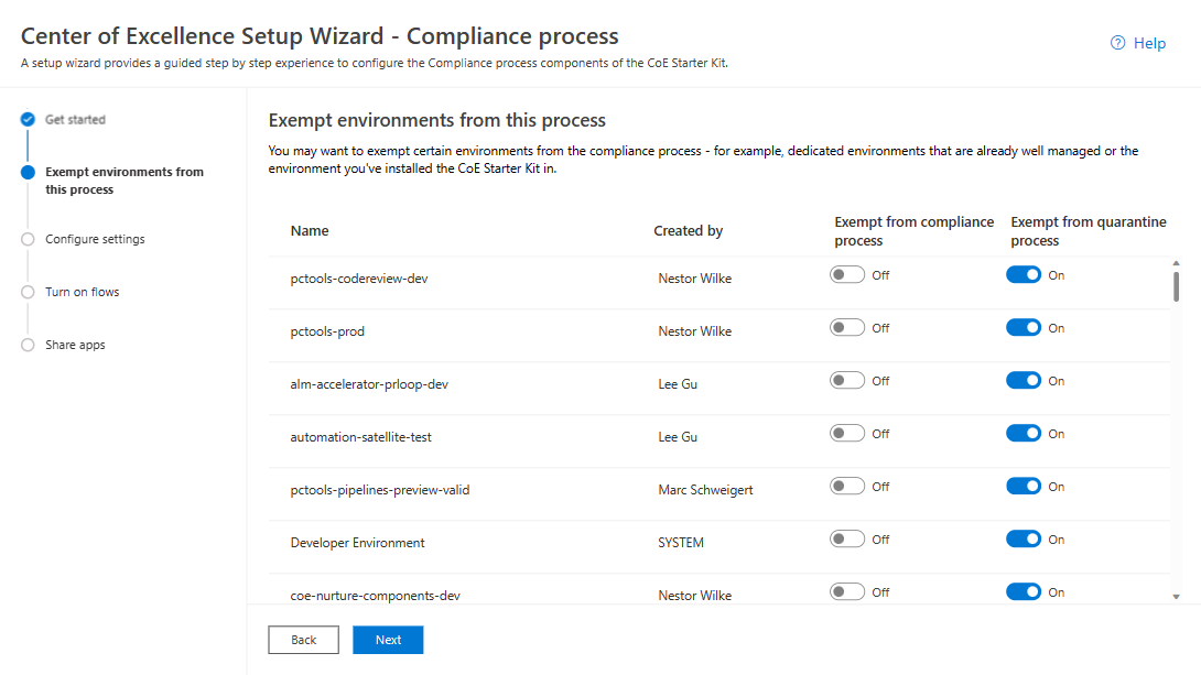 You can exempt environments from the compliance process, for example well-managed and dedicated environments or the environment with the CoE Starter Kit. For more information, see Establishing an environment strategy.