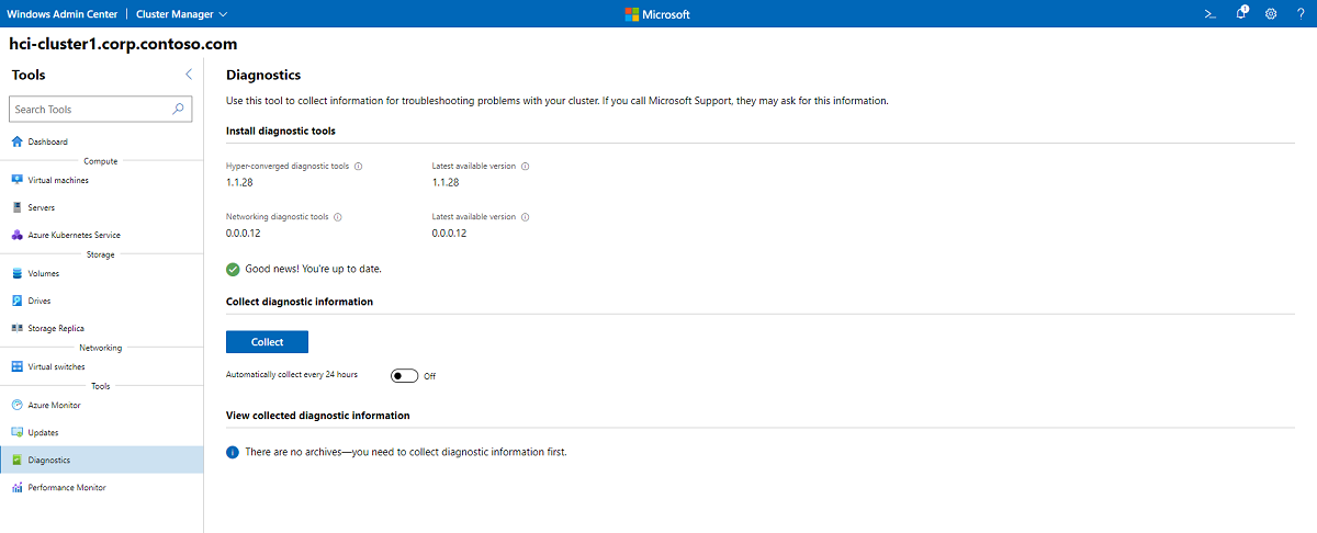To begin collecting diagnostic data, click Collect. You should see a message that says "Collecting diagnostic information. This may take a few minutes." After the initial data collection, if you want to automatically collect data every 24 hours, change the slider to On.