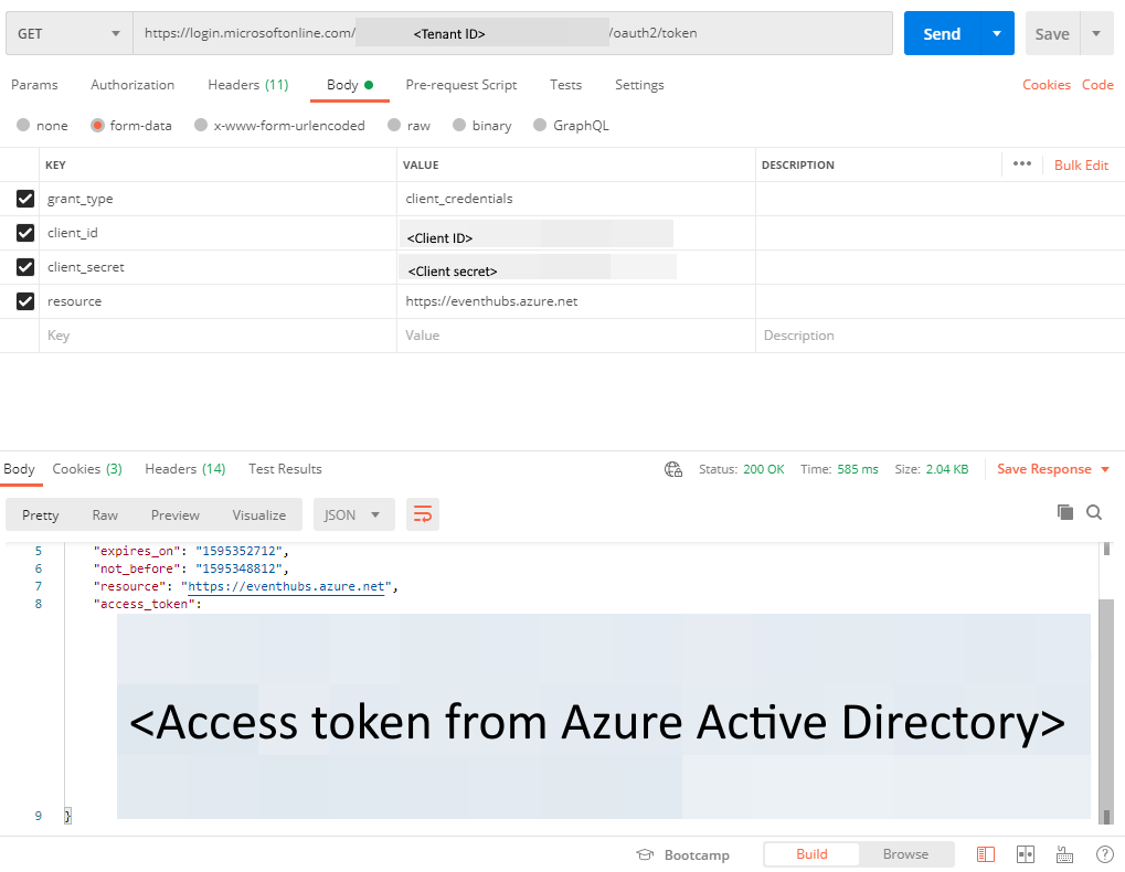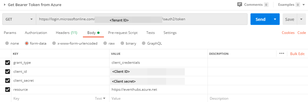 This article gives you an example of getting a Microsoft Entra token that you can use to send events to and receive events from an Event Hubs namespace. It uses the Postman tool for testing purposes.