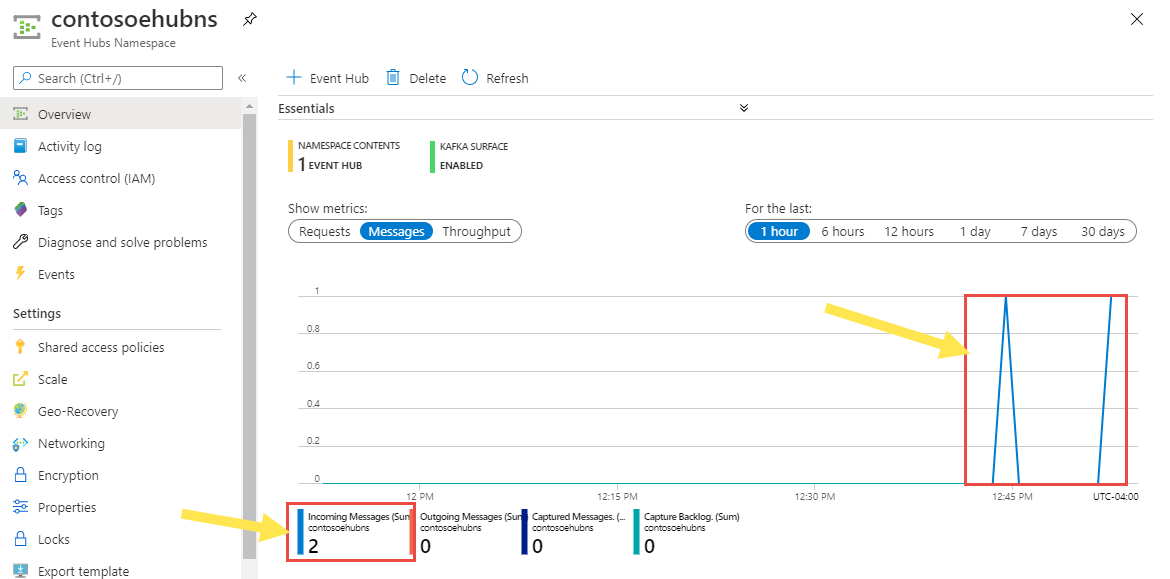 with the code 201 as shown in the following image.On the namespace page in the Azure portal, you can see that the messages are posted to the queue.