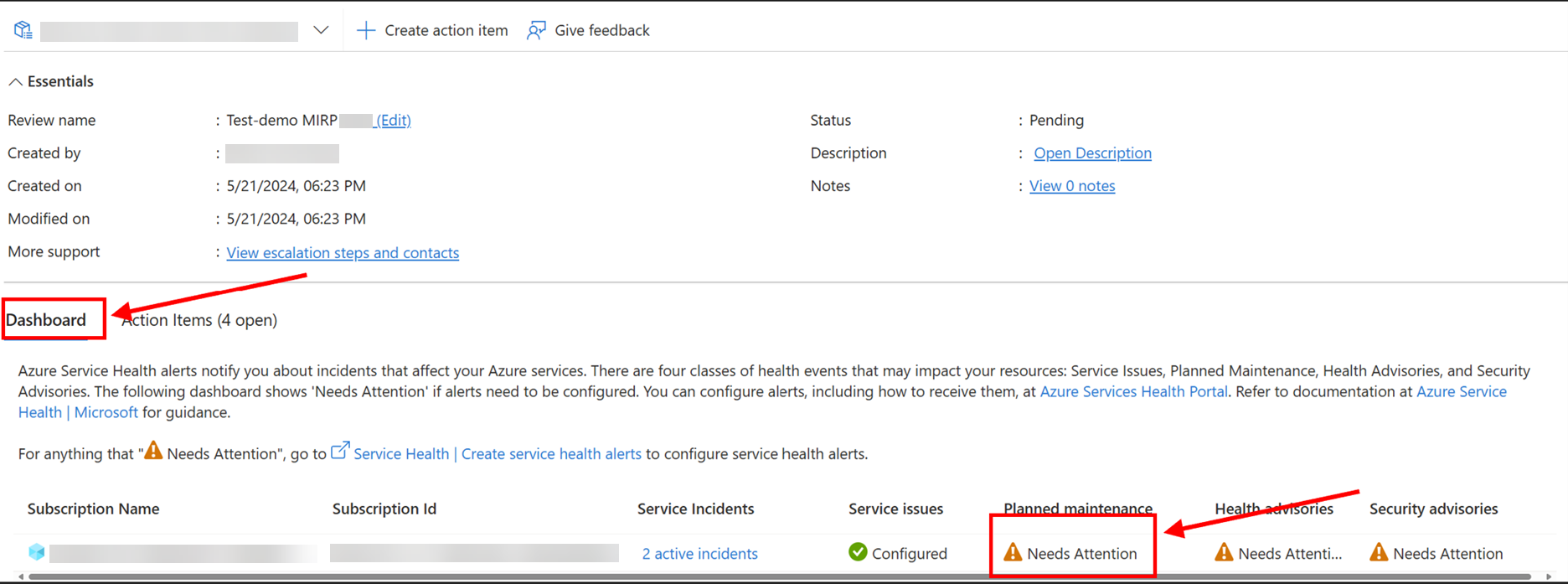 Under Dashboard view, you see data about Service Health Alert settings for all the Azure subscriptions linked to your workload. The data includes the status of Service Incident, Service Issue, Planned Maintenance Health Advisories, and Security Advisories.