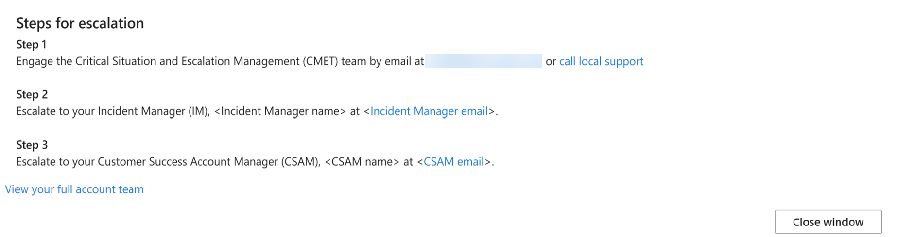Select "View escalation steps and contact" under the More support.