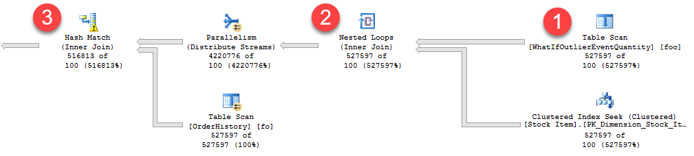 - For the Hash Match operation, notice the small warning symbol, which in this case is indicating a spill to disk.