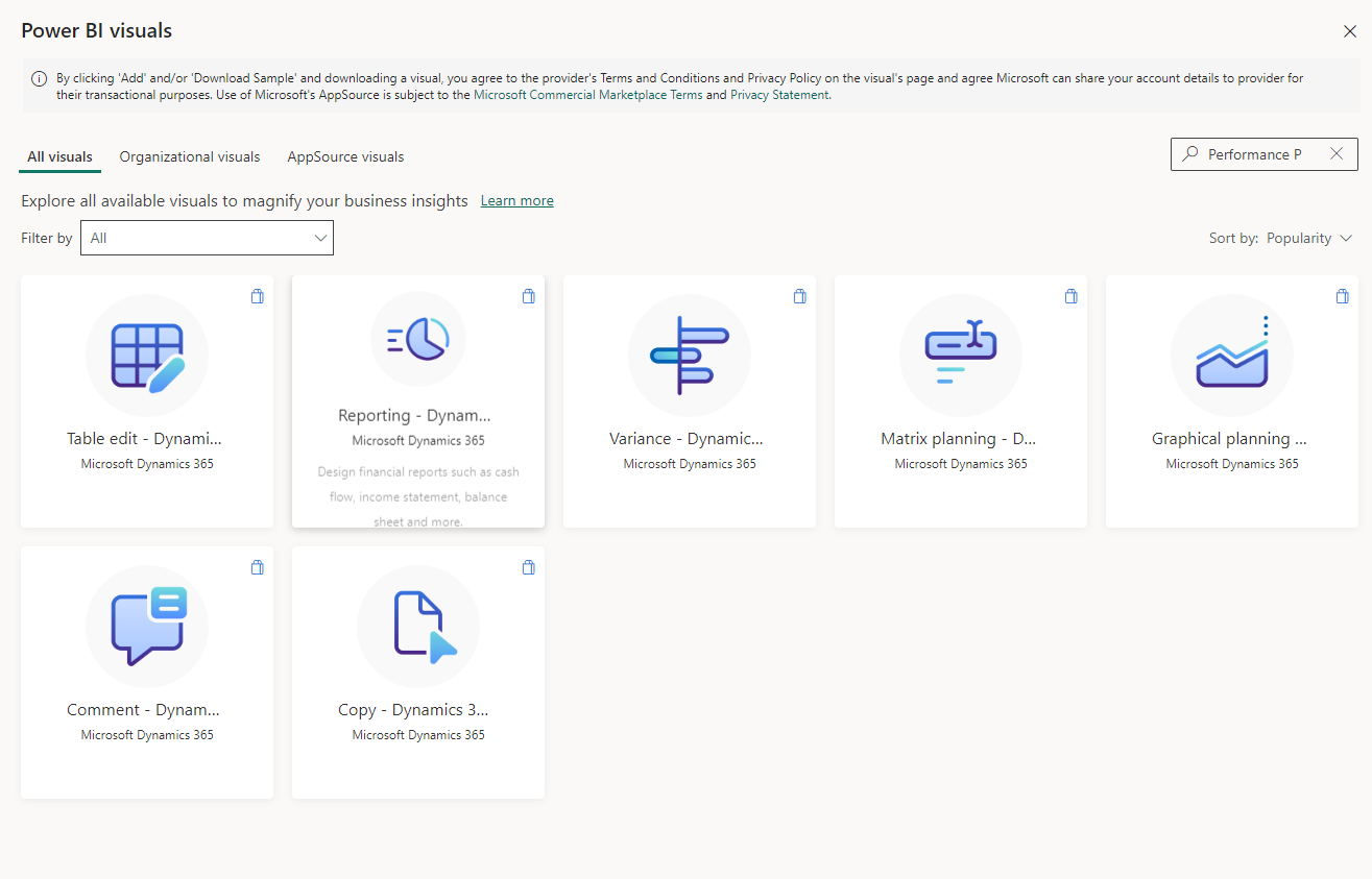 Import Business performance planning visuals from Microsoft AppSource - For more information, see Import a Power BI visual from AppSource into your workspace.
