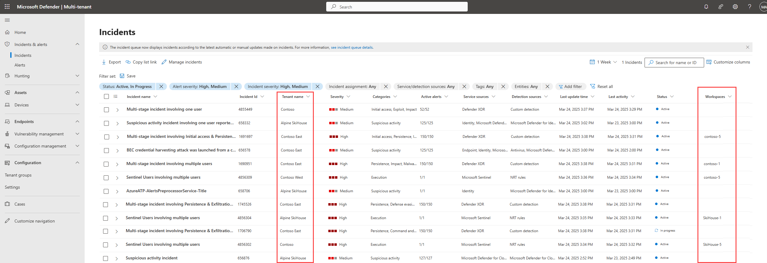Go to the Incidents page in Microsoft Defender multitenant management. The Tenant name and Workspaces columns show which tenant the incident originates from: