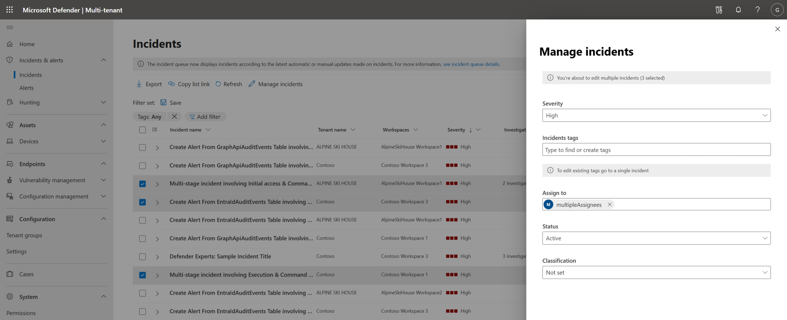 On the incidents flyout pane you can assign incidents, assign incidents tags, set the incident status, and classify multiple incidents for multiple tenants simultaneously.