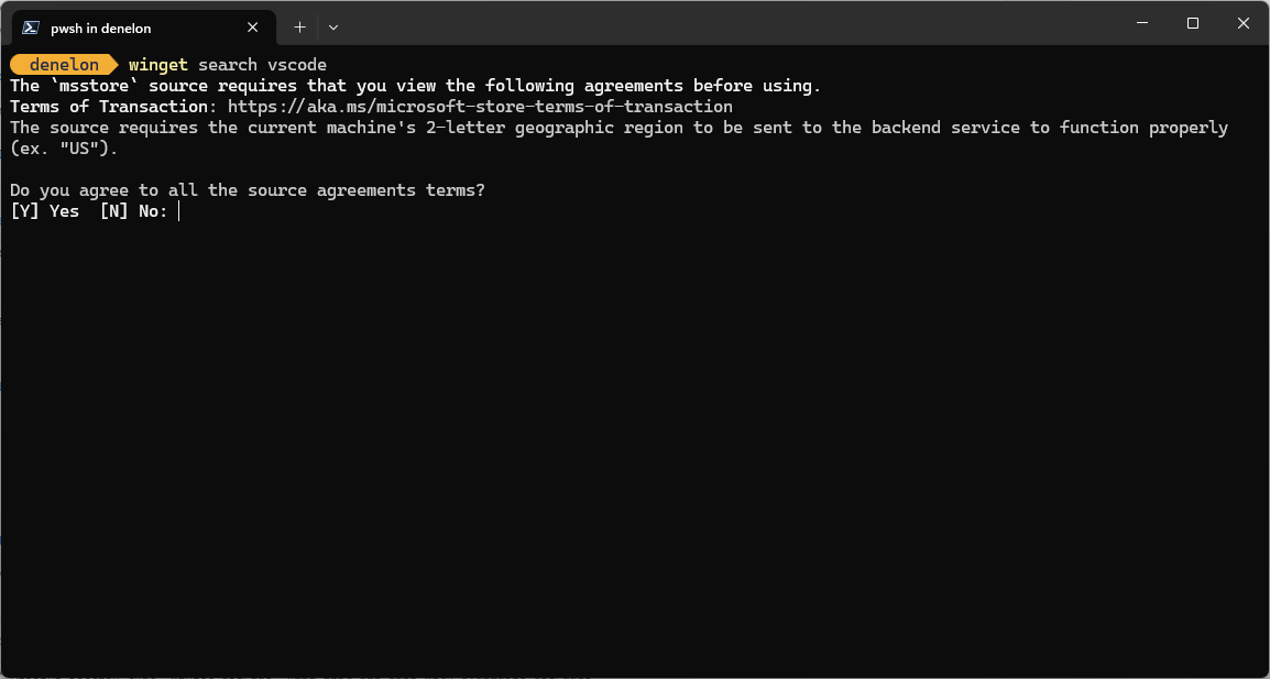 You can use the --accept-source-agreements option to accept the source license agreement and avoid the prompt.