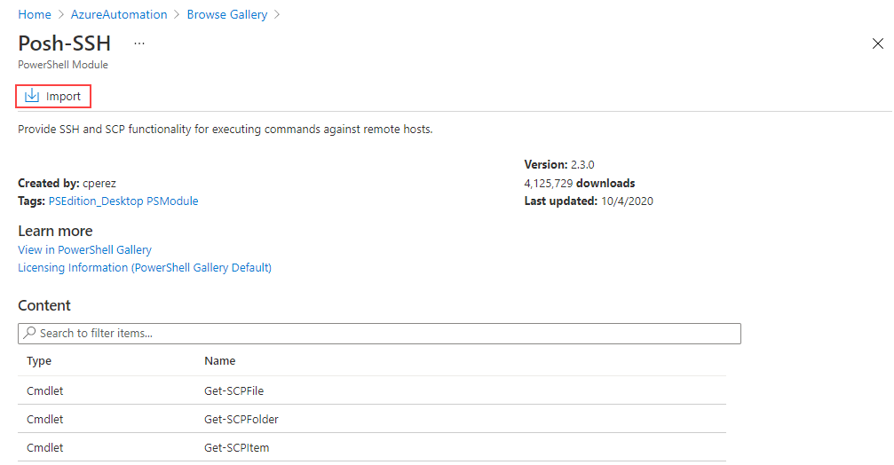 Per installare il modulo direttamente in Automazione di Azure, fare clic su Importa.