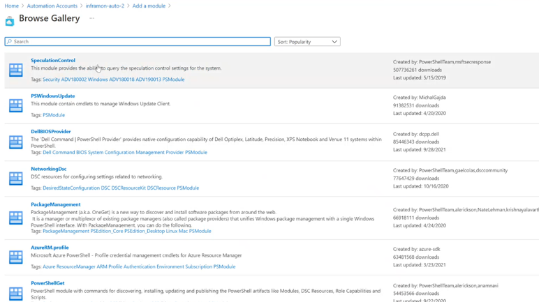 È anche possibile trovare moduli da importare nel portale di Azure. L'elenco è disponibile nei Moduli per l’account di Automazione in Risorse condivise.