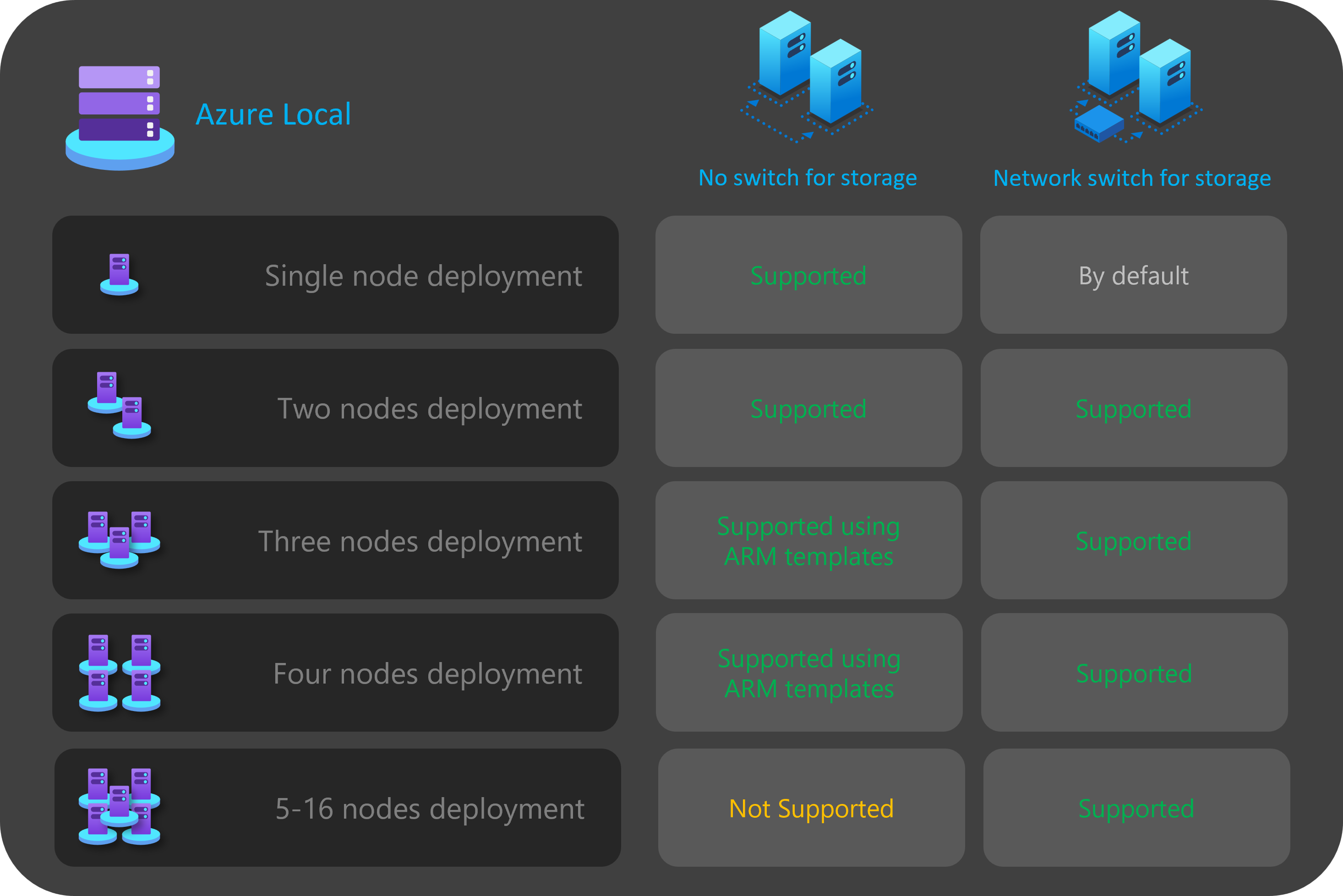 Se i carichi di lavoro richiedono quattro o più nodi: non è possibile distribuire e usare una configurazione senza commutatori per il traffico di rete di archiviazione. È necessario includere un commutatore fisico con supporto per Remote Direct Memory Access (RDMA) per gestire il traffico di archiviazione. Per altre informazioni sull'architettura di rete dell'istanza locale di Azure, vedere Panoramica dei modelli di riferimento di rete.