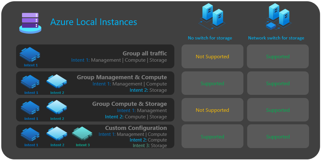 Prima di acquistare un computer per l'ambiente locale di Azure, è necessario disporre di almeno una scheda qualificata per la gestione, il calcolo e l'archiviazione, perché tutti e tre i tipi di traffico sono necessari in Locale di Azure. La distribuzione cloud si basa su Network ATC per configurare le schede di rete per i tipi di traffico appropriati, quindi è importante usare schede di rete supportate.